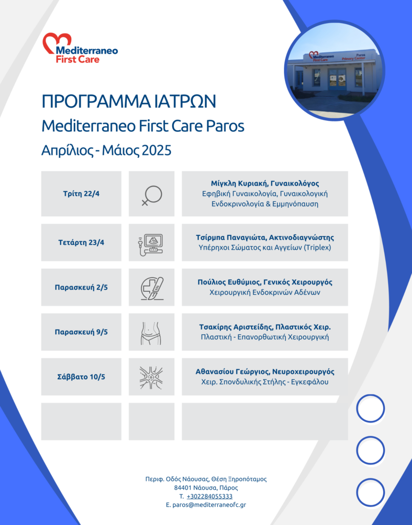 Το προσεχές διάστημα, ιατροί – επιστημονικοί συνεργάτες του Mediterraneo Hospital και του Mediterraneo First Care Athens, θα πραγματοποιήσουν ραντεβού στο Mediterraneo First Care στην Πάρο ως εξής: